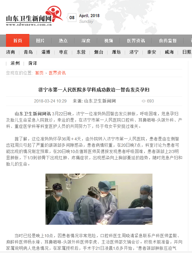 山东卫生计生网--济宁市第一人民医院多学科成功救治一智齿发炎孕妇