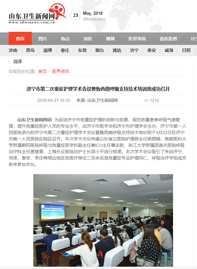 山东卫生新闻网--济宁市第二次重症护理学术会议暨鲁西南呼吸支持技术培训班成功召开