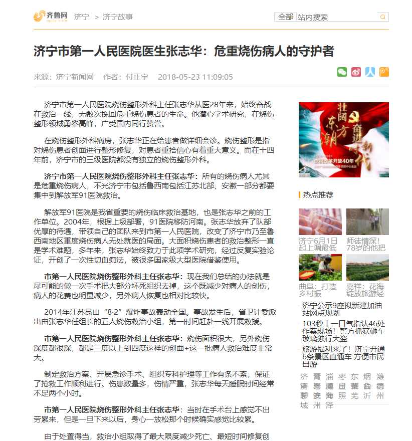 齐鲁网--济宁市第一人民医院医生张志华:危重烧伤病人的守护者