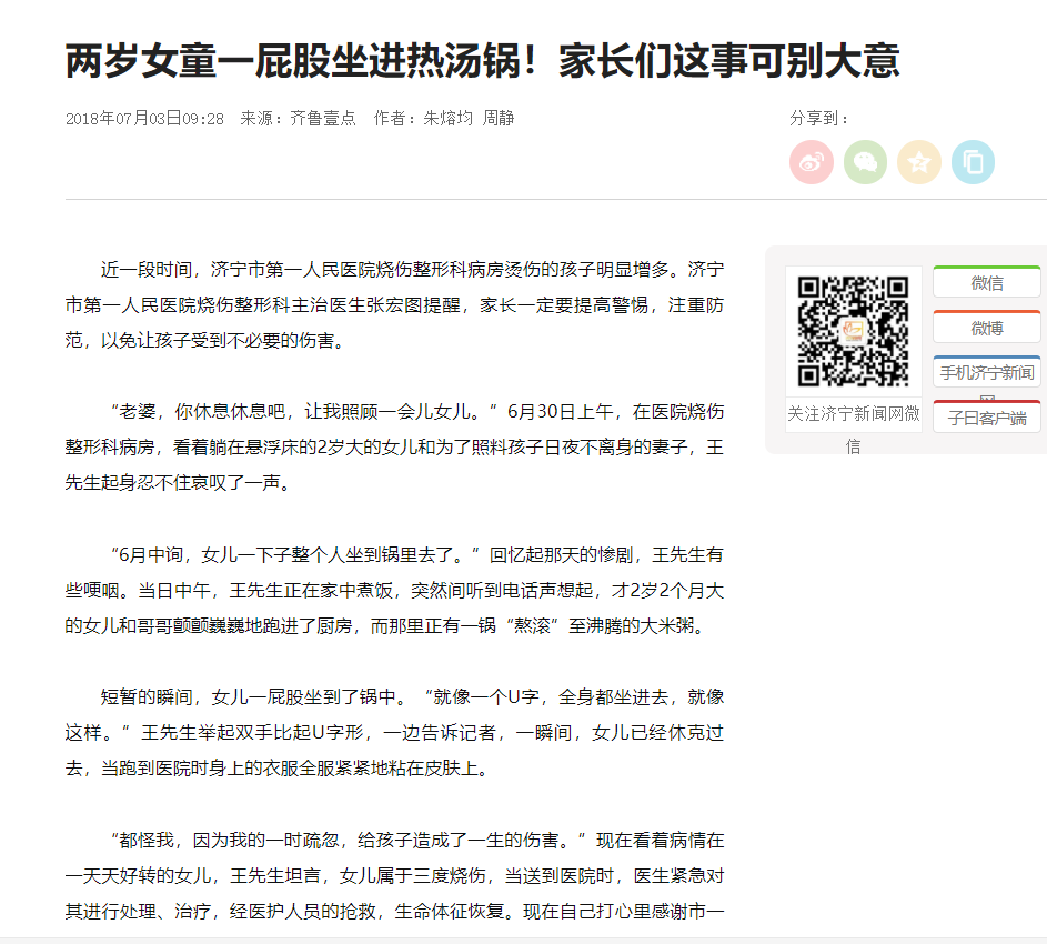 济宁新闻网--两岁女童一屁股坐进热汤锅!家长们这事可别大意