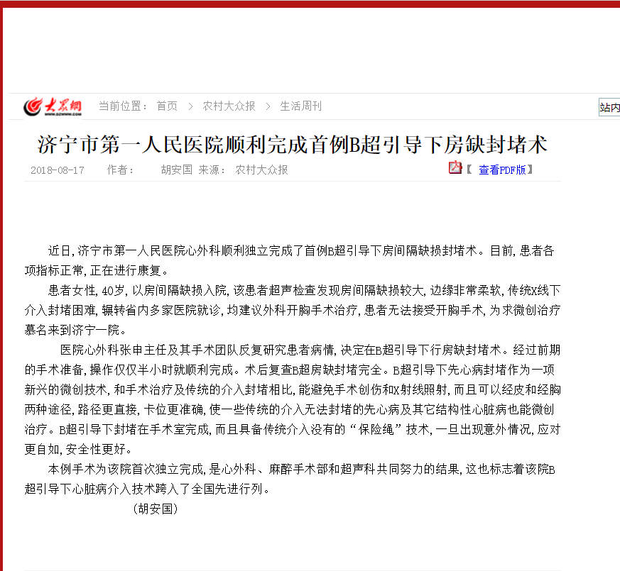 大众网--济宁市第一人民医院顺利完成首例B超引导下房缺封堵术