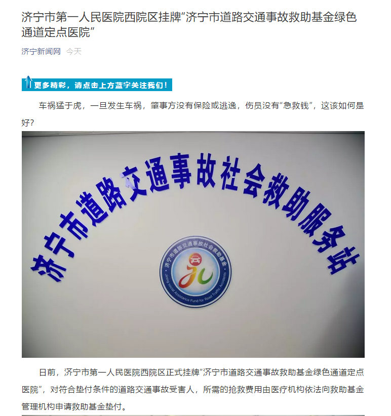济宁新闻网--济宁市第一人民医院西院区挂牌“济宁市道路交通事故救助基金绿色通道定点医院”