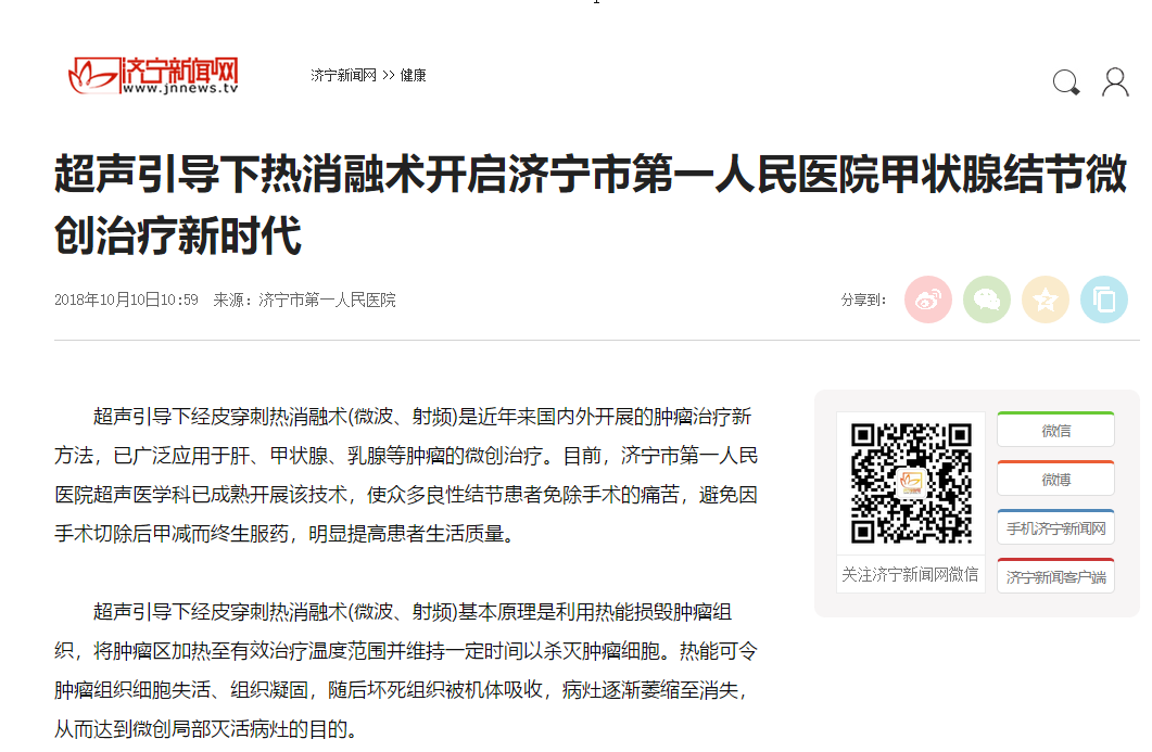 济宁新闻网--超声引导下热消融术开启济宁市第一人民医院甲状腺结节微创治疗新时代