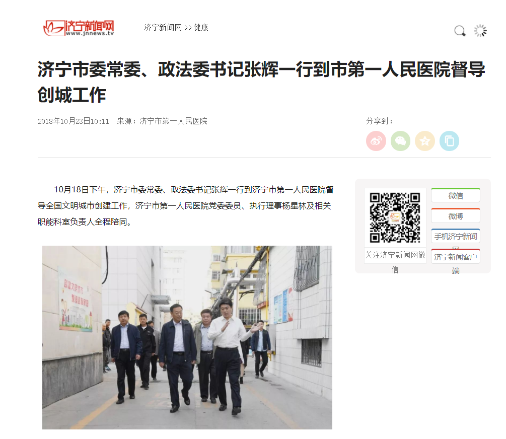 济宁新闻网--济宁市委常委、政法委书记张辉一行到市第一人民医院督导创城工作
