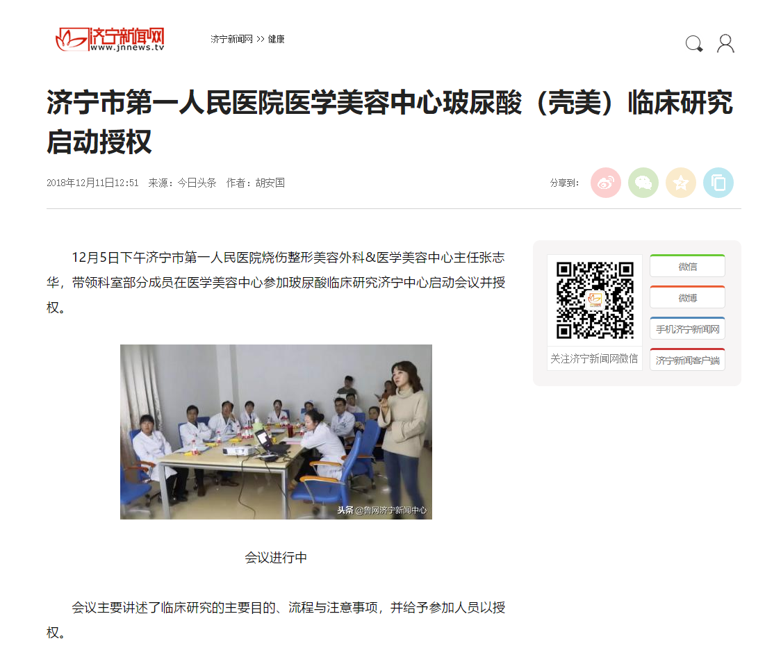 济宁新闻网--济宁市第一人民医院医学美容中心玻尿酸(壳美)临床研究启动授权