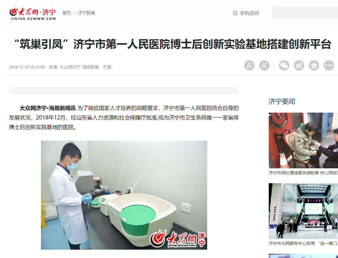 大众网--“筑巢引凤”济宁市第一人民医院博士后创新实验基地搭建创新平台