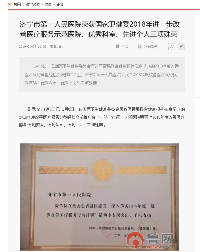鲁网--济宁市第一人民医院荣获国家卫健委2018年进一步改善医疗服务示范医院、优秀科室、先进个人三项殊荣