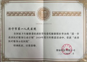 济宁市第一人民医院荣获2020年度全国改善医疗服务三项殊荣