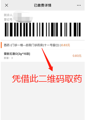 对于复诊患者,医生根据患者情况,通过线上门诊开具药品后,患者根据推送消息进入小程序,在线上诊疗缴费中缴费后,可到总院区门诊药房出示电子二维码线下取药。