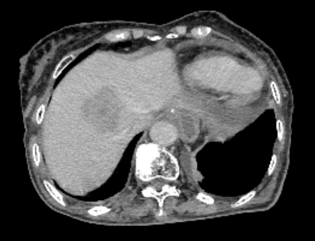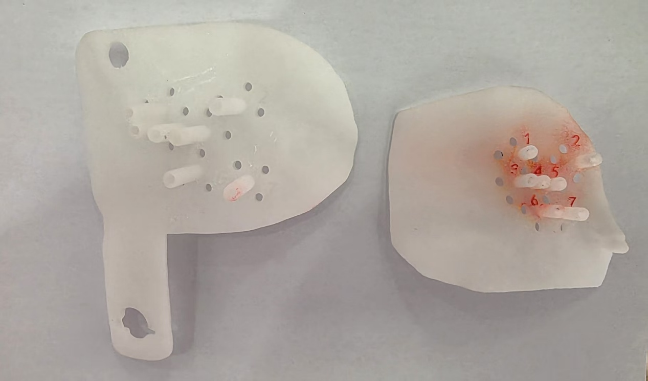 患者老年女性,食管癌术后8年,行术后放疗。近期因肿瘤标记物持续升高,3月17日复查上腹部磁共振发现肝SVIII段异常信号,考虑转移瘤。患者高龄,肝脏单发转移病灶,常规介入治疗效果差,且病灶紧邻肝静脉、门静脉分支,经医院肿瘤科微创诊疗团队与放疗团队讨论并与患者家属详细沟通治疗方案,在征求家属同意后确定行3D打印模板辅助CT引导下肝转移瘤碘125粒子植入术。